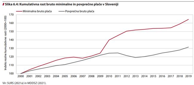Minimalna plača je zaradi zakonskih intervencij v Sloveniji precej prehitevala rast povprečne slovenske plače, kar je lepo vidno v spodnjem grafičnem prikazu: minimalna bruto plača je v zadnjih dvajsetih letih realno narasla za 65 odstotnih točk, povprečna pa za približno 30 odstotnih točk manj.