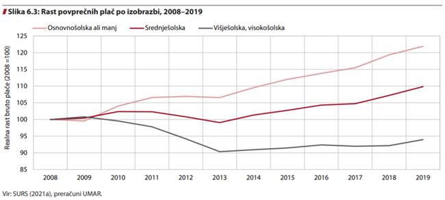 Še zanimivejši je presek rasti plač glede na izobrazbo. Od leta 2008 se je plača realno najbolj zvišala nižje izobraženim in sicer za skoraj 22 odstotkov. Srednješolsko izobraženim je plača zrasla za desetino, zaposlenim s terciarno izobrazbo, ki praviloma ustvarjajo višjo dodano vrednost, pa se je plača v obdobju 2008–2019 realno znižala za 6 odstotkov.