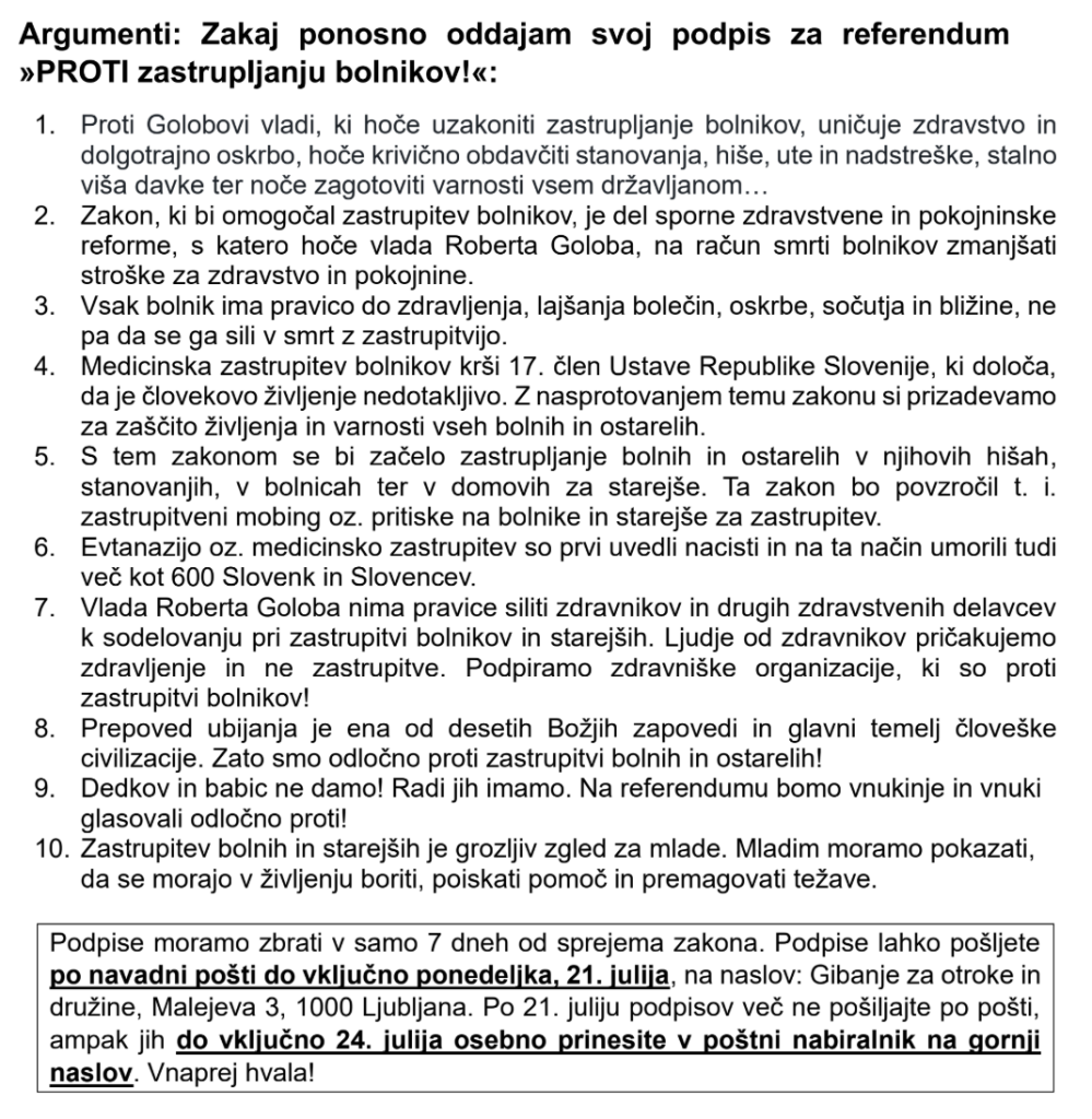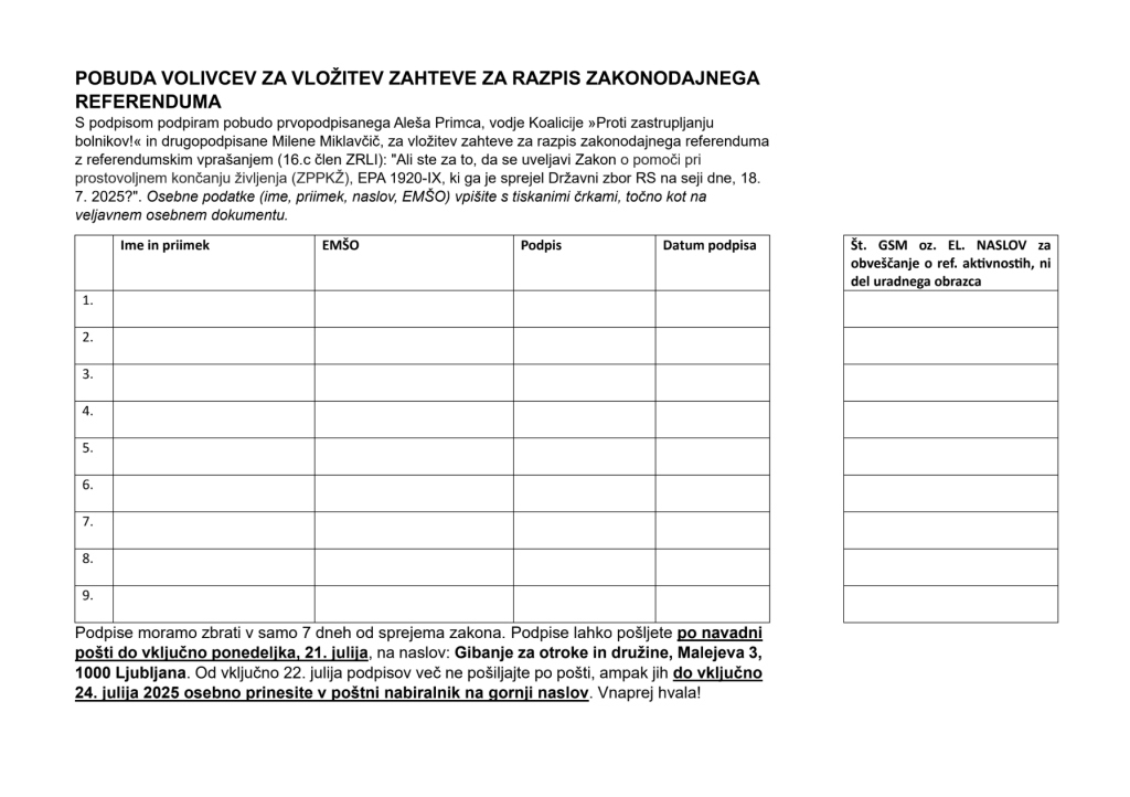Še pred dokončno odločitvijo poslank in poslancev je vodja Gibanja za otroke in družine napovedal zbiranje podpisov za naknadni zakonodajni referendum. Kot je navedel, se začenja »eno od častnih poslanstev vseh nas«: boj proti zakonu, ki bi uvedel zastrupljanje bolnikov in starejših. V sedmih dneh je treba zbrati 2.500 podpisov, je navedel Primc in pozval k zbiranju podpisov po družinah, v okviru različnih skupin, na množičnih dogodkih in po mašah. V nadaljevanju objavljamo obrazec in navodila za oddajanje podpisov.
