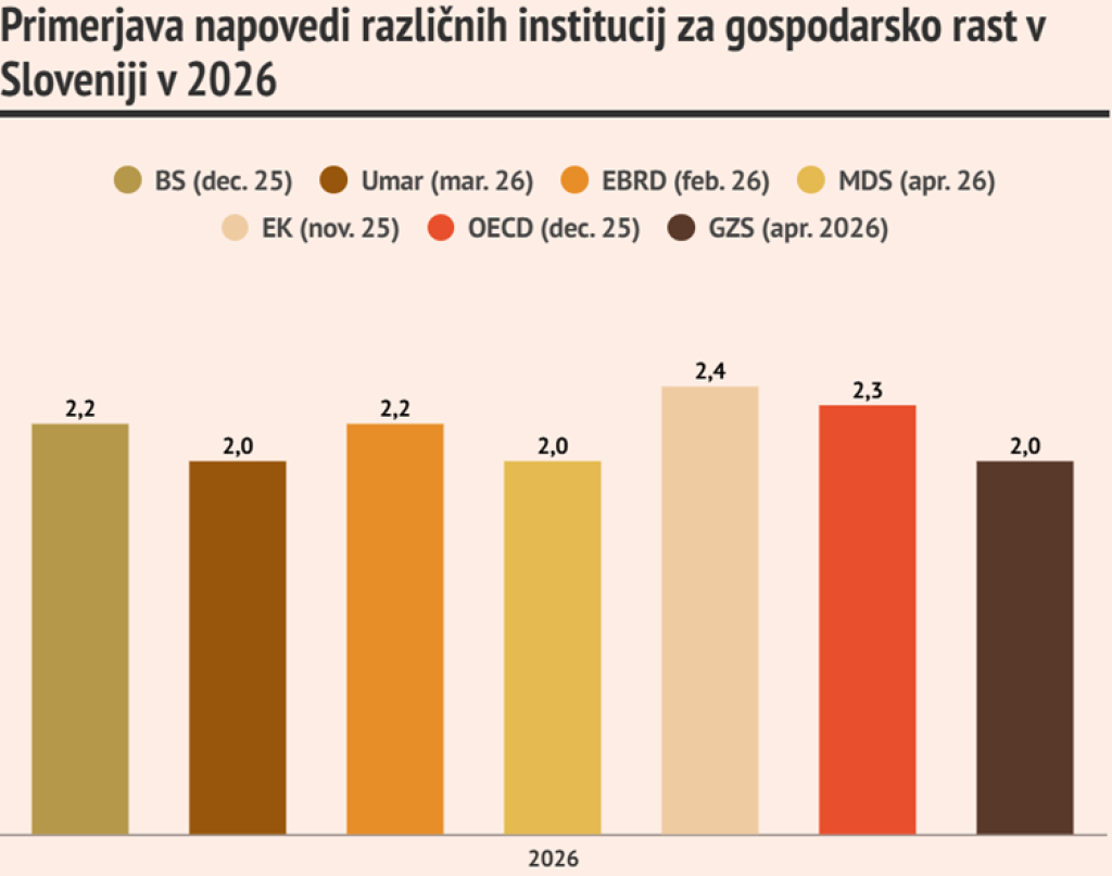 Najnovejša pomladanska napoved Gospodarske zbornice Slovenije razkriva manj optimistično sliko slovenskega gospodarstva. Ocena rasti BDP za leto 2026 je bila znižana na 2,0 odstotka, medtem ko se inflacija zvišuje na približno 3,1 odstotka. Gre za kombinacijo, ki kaže na upočasnjevanje gospodarske dinamike ob hkratnem naraščanju stroškov.