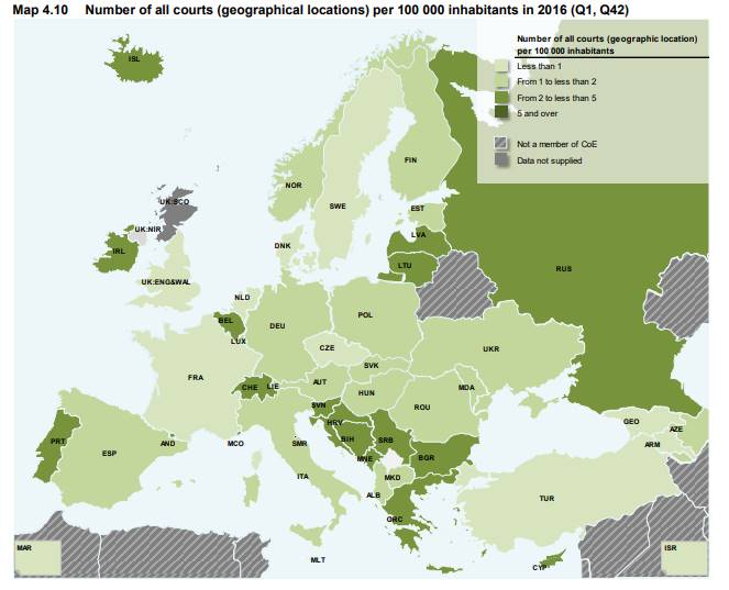 Da se v Sloveniji radi pravdamo kaže tudi število sodišč na 100.000 prebivalcev. Evropsko povprečje prvostopenjskih sodišč je 1,22 na 100.000 prebivalcev, v Sloveniji pa smo to število podvojili na 2,7 sodišč na 100.000 prebivalcev.