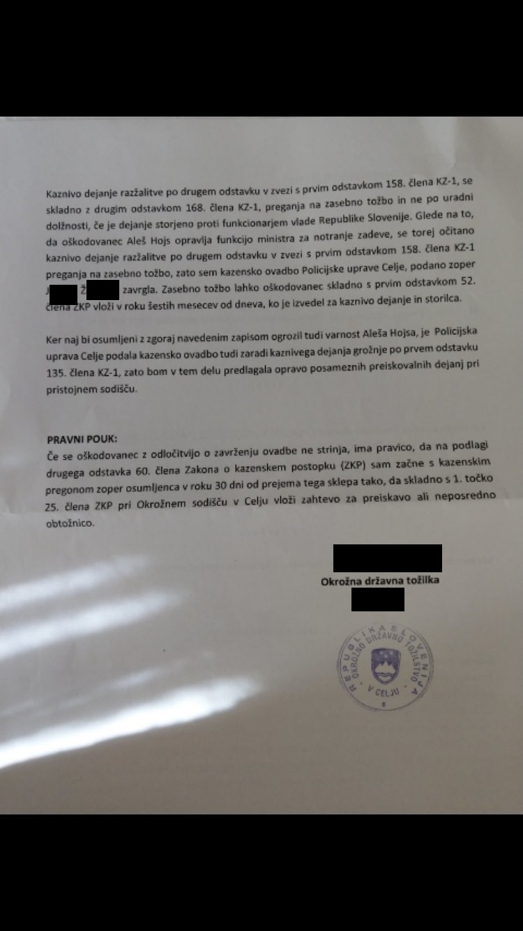9. februarja je tožilka zavrgla prijavo ministra za notranje zadeve Aleša Hojsa, ki je prijavil uporabnika omrežja Facebook A.B. zaradi grožnje, ki jo je zapisal v komentarju pod objavo članka na omenjenem družbenem omrežju. Članek se je nanašal na Hojsov obisk nasilnih protestov, ki so se v Ljubljani odvijali 5. novembra lani, minister pa si je kraj dogodka ogledal v spremstvu policistov.