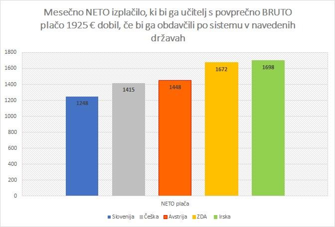 Od povprečne učiteljske plače, ki znaša 1935 evrov BRUTO, slovenski učitelj dobi NETO nakazilo 1248 evrov. Po avstrijski obremenitvi plač bi za enako BRUTO plačo prejel točno 200 evrov mesečno več, oziroma 1448 evrov.