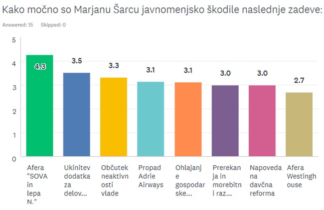 Ampak katera afera na njegovi javnomnenjski podobi pušča največje posledice? Sodelujoči so njihovo škodljivost ocenjevali na petstopenjski lestvici, pri čemer je 1 "sploh mu ni škodilo" in 5 "zelo mu je škodilo".
