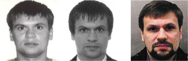 Levo fotografija Anatolija Čapige iz potnega lista iz leta 2003, v sredini fotografija "Ruslana Boširova" iz leta 2009 in desno fotografija, ki jo je za osumljenca izdala britanska policija