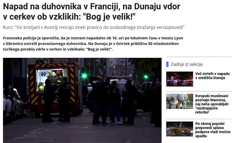 Pri poročanju o dogodkih in obsodbah politikov so dejanja relativizirali. Zapisali so: "Francoski predsednik Macron je obsodil, kot je dejal, islamski teroristični napad ...", "Župan Nice je rekel, da je napadalec kričal Alah je velik" in "Domnevni napadalec je kričal Bog je velik". Kot da napad in teroristični vzkliki niso absolutno dejstvo, ampak le interpretacija obeh politikov, s čimer se očitno izogibajo dejstvom. Zanimivo, pri poročanju o domnevno ali subjektivno dojetih "avtoritarnih" potezah denimo Janeza Janše, je izrazov "kot je rekel" in "domnevno" precej manj. To predstavljeno kot absolutno dejstvo.