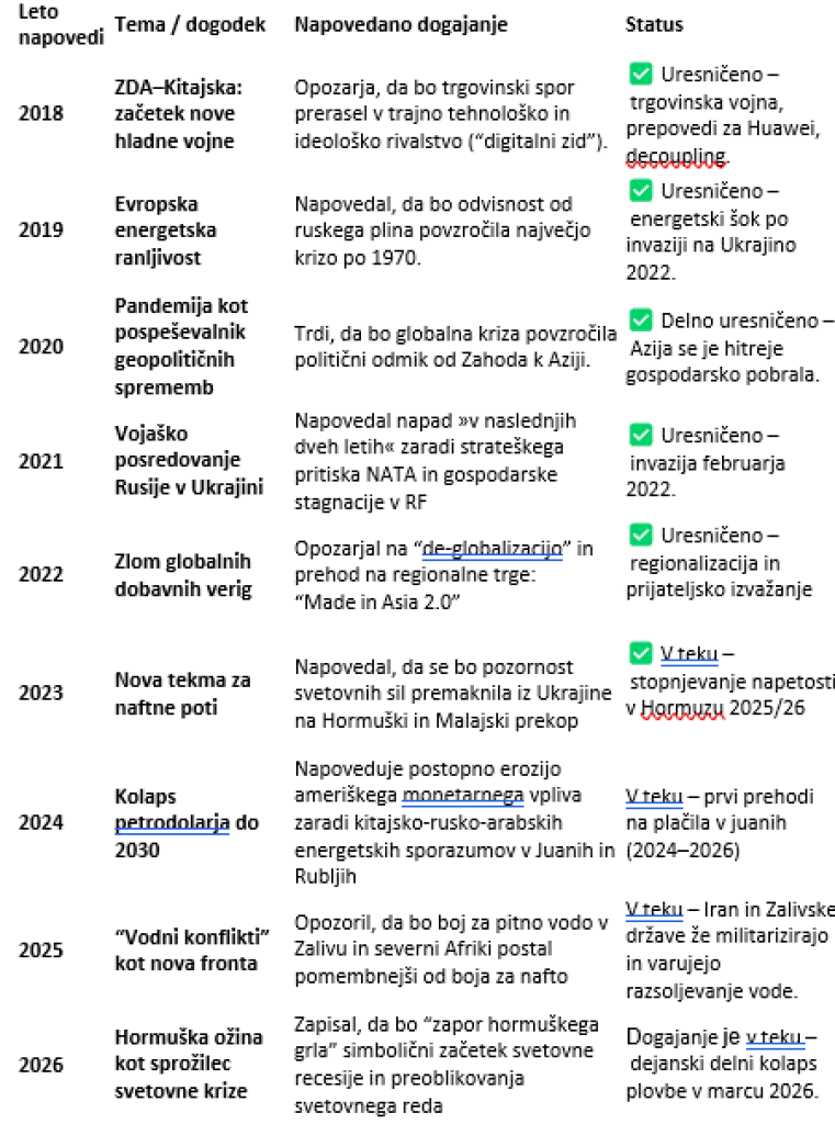 Njegov nedavni podkast Kako bo Hormuška ožina sprožila III. svetovno vojno (How the Strait of Hormuz Will Start World War 3) je odprl vročo razpravo o tem, kako bi zaprtje komaj 33 kilometrov široke Hormuške ožine lahko pognalo svet v gospodarsko in politično krizno spiralo, večjo od vseh kriz doslej.