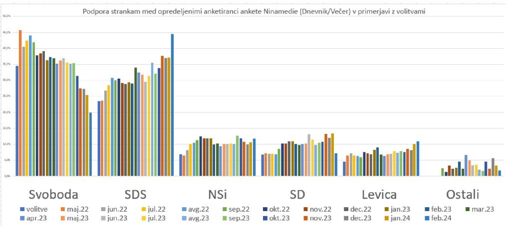 V primeru volitev bi svoj glas namenilo Golobovi Svobodi le slabih 20 odstotkov opredeljenih volivcev. Največjo opozicijsko stranko bi podprlo skoraj 45 % opredeljenih volivcev. Največji padec je pričakovano zabeležila stranka Socialni demokrati, ki bi jo volilo le 7,2 % opredeljenih volivcev, kar je skoraj polovični padec od zadnjih meritev javnega mnenja.