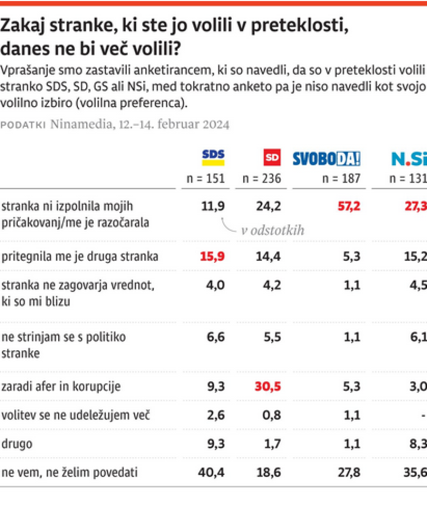 Ninamedia pa je tokrat za Dnevnik preverjala tudi odnos volivcev do svoje stranke z vidika, zakaj določene stranke ne bi več volili. V rezultatih vprašalnika se jasno kaže, da se NSi in Svoboda borita z razočaranjem oziroma neizpolnitvijo pričakovanj. Socialne demokrate pa je pričakovano zaznamovala korupcija.