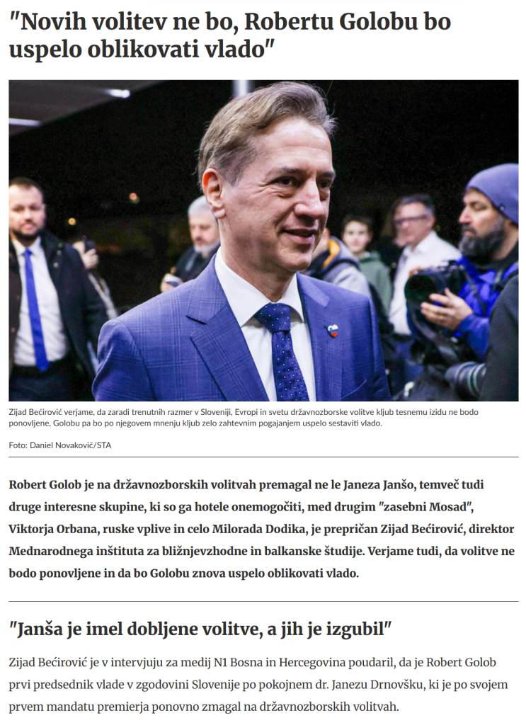 Podobno so si privoščili z objavo izjave prvega obraza Inštituta IFIMES Zijada Bečirovića, da »novih volitev ne bo, Robertu Golobu bo uspelo oblikovati vlado«. Isti inštitut je bil sicer po javno dostopnih podatkih aplikacije Erar več let med prejemniki sponzorjev paradržavnih podjetij, med drugim Elesa in tudi (Golobovega) Gen-I-ja. Po nekaterih informacijah naj bi pomagal tudi pri pridobivanju poslov Gen-I v Makedoniji. Tega iz članka ne izvemo.