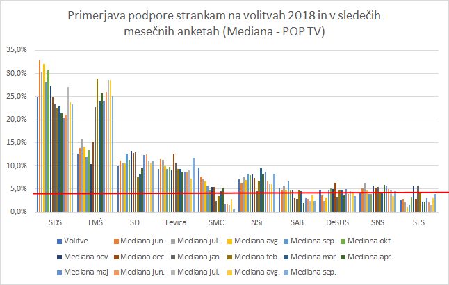 Kot je razvidno z grafa, je SDS v mesecih po volitvah izgubljala, v zadnjih mesecih pa se ji je podpora nekoliko dvignila. Ključen prelom za LMŠ je bil minulega decembra in januarja, od takrat niha okrog četrtinske podpore opredeljenih volivcev. SD je imela manjšo luknjo in se po njej vrača, Levica je izgubljala od evropskih volitev naprej in se zdaj morda pobira.