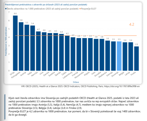 Delež prebivalcev, starejših od 65 let v Sloveniji vztrajno raste, kar pomeni več multimorbidnosti, več bolezni ter bistveno večje potrebe po diagnostiki, kontrolah, specialističnih obravnavah in dolgotrajnih zdravljenjih. Te potrebe naraščajo hitreje kot linearno s številom prebivalcev, zato absolutna rast števila zdravnikov ne dohaja realnega pritiska na sistem. Po podatkih OECD Health at a Glance 2025 je Slovenija leta 2023 dosegla 3,5 zdravnika na 1000 prebivalcev (povprečje OECD 3,9; povprečje EU približno 4,2). Gre za napredek glede na preteklo desetletje, vendar Slovenija še vedno ostaja pod povprečjem večine držav EU. Za dosego povprečja EU27 bi potrebovali več kot 1400 dodatnih zdravnikov.