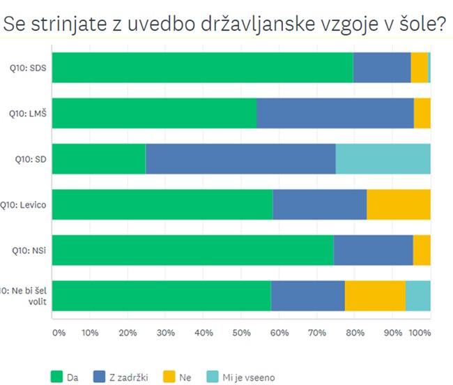Večina se namreč brez zadržkov strinja z uvedbo predmeta z "državljansko vzgojo" v šoli, in to ne glede na ideološko, oziroma politično prepričanje. Prav tako večina, razen pri simpatizerjih Levice, meni, da bi v učilnicah javnih šol in vrtcev morala biti prisotna slovenski grb in/ali zastava. Slednje je pomembno sporočilo ravnateljem, saj je prisotnost slovenske simbolike v igralnicah in razredih prej izjema kot pravilo.