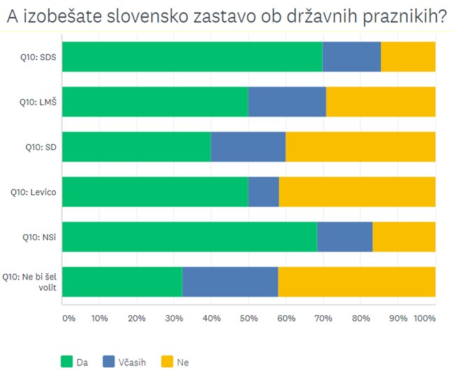 Velika večina vseh sodelujočih, ne glede na politično barvo, ima doma slovensko zastavo. Teh je še najmanj med volilno pasiviziranimi, vseeno pa 60 odstotkov. Precej drugače pa je pri izobešanju zastave ob državnih praznikih.