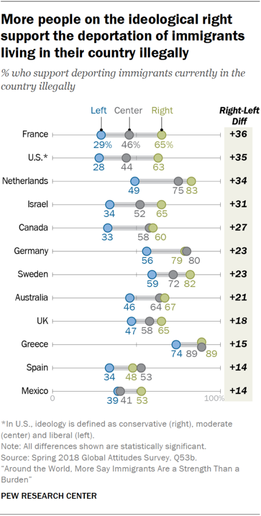 Pri tem na splošno velja, da so deportaciji ilegalnih migrantov (karso praktično vsi, ki prihajajo v zadnjih migrantskih valih v Evropo), bolj naklonjeni volivci ideološke desnice kot levice.