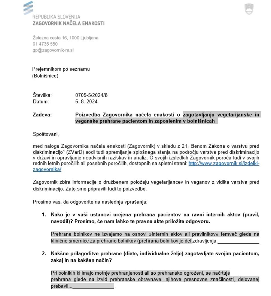 Poizvedba Zagovornika načela enakosti o zagotavljanju vegetarijanske in veganske prehrane pacientom in zaposlenim v bolnišnicah je bila na zavode sicer naslovljena 5. avgusta s pojasnilom, da zbirajo informacije o družbenem položaju vegetarijancev in veganov z vidika varstva pred diskriminacijo. Priložili so vprašalnik, pod katerega se je podpisala Jelena Aleksić, njihova koordinatorka spremljanja, ozaveščanja in preventive, sicer nekoč asistentka Iva Vajgla v Bruslju, ko je slednji opravljal funkcijo evropskega poslanca.