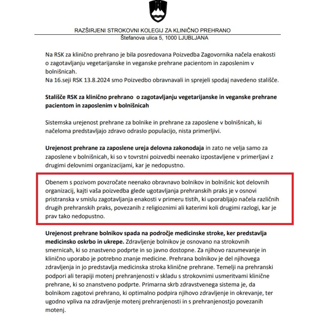 Za dodaten komentar smo se na Nado Rotovnik Kozjek, predsednico razširjenega strokovnega kolegija za klinično prehrano, obrnili tudi sami. Pravi, da se stroka potrudi tudi za takšne ali drugačne izjeme. »Pri posameznikih, ki imajo določena prepričanja, lahko zagotavljamo posebne oz. alternativne načine prehranjevanja, ki pa vsekakor niso samo veganski ali vegeterjanski, temveč tudi številni drugi. In to je že druga velika sporna točka te pobude zagovornika načela enakosti, zakaj nas torej sprašujejo samo po teh načinih prehranjevanja in to prav nekdo, ki zagovarja načelo enakosti.