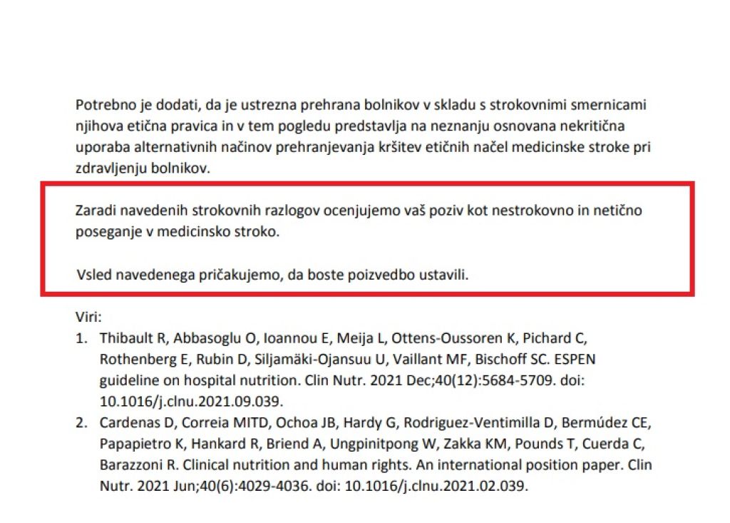 »Na neznanju osnovana nekritična uporaba alternativnih načinov prehranjevanja predstavlja kršitev etičnih načel medicinske stroke pri zdravljenju bolnikov. Zato ocenjujemo vaš poziv kot nestrokovno in netično poseganje v medicinsko stroke.«