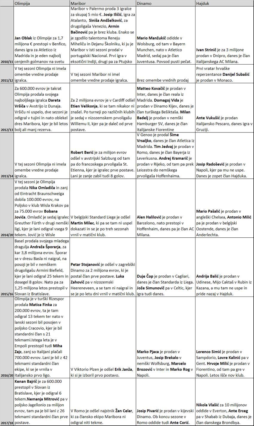 Zaslužki slovenskih klubov s prodajami svojih igralcev v tujino niso slabi, a ti se kot po pravilu tam ne izkažejo, nazadujejo in ne uspejo. Statistika prodaj Olimpije, Maribora, Dinama in Hajduka za zadnjih 8 sezon nazorno izkazuje to za Slovenijo porazno sliko.