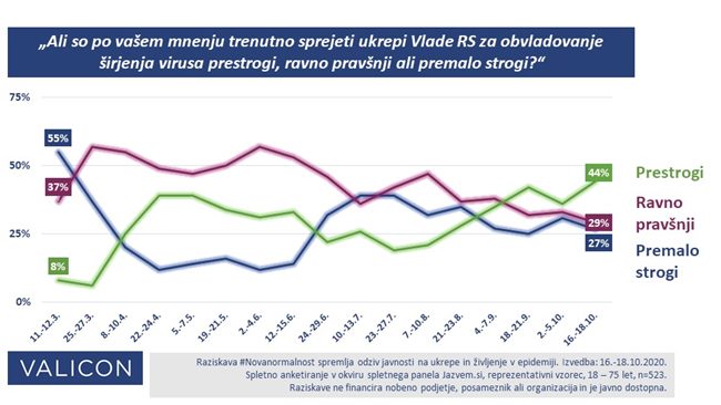 Kljub temu, da smo že v času anketiranja praktično vsak dan doživljali nove rekorde dnevnih potrjenih okužb ter da ukrepi še niso bili zaostreni do mere, kot so danes, v oči bode ugotovitev, da so se skoraj polovico vprašanim že zdeli prestrogi.