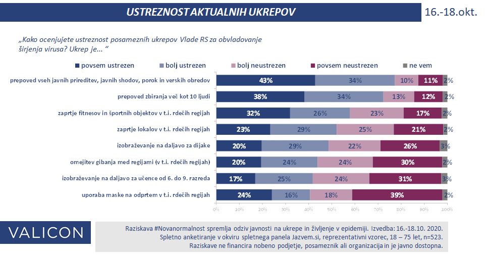 Najbolj kritična je javnost do ukrepa nošenja mask na odprtem, saj 39 odstotkov vprašanih meni, da je ta ukrep povsem neustrezen, še dodatnih 18 odstotkov pa, da je bolj neustrezen. Ukrep je kot popolnoma ustrezen ocenilo 24 odstotkov vprašanjih, kot bolj ustrezen pa 16,5 odstotka.
