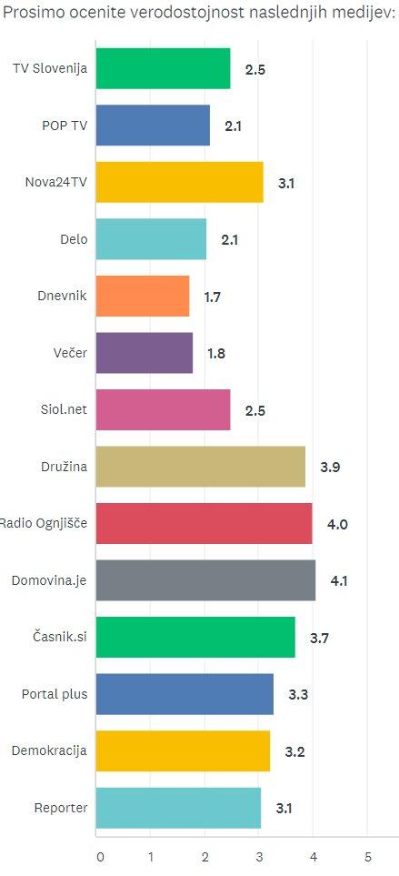 Verodostojnost posameznih medijev ste sodelujoči ocenjevali od 1 do 5, pri čemer je bil 1 povsem neverodostojen in 5 povsem verodostojen.