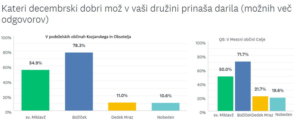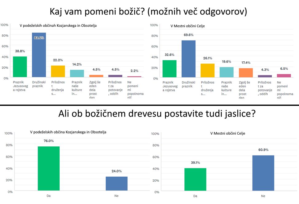 Precej v neskladju z številom tistih, ki božič dojemajo kot Jezusovo rojstvo, pa so odgovori o tem, v koliko domovih ob božični smrečici postavljajo tudi jaslice. Slednje velja kar za dobre tri četrtine sodelujočih prebivalcev kozjansko-obsoteljskega ter slabih 40 odstotkov prebivalcev MO Celje.