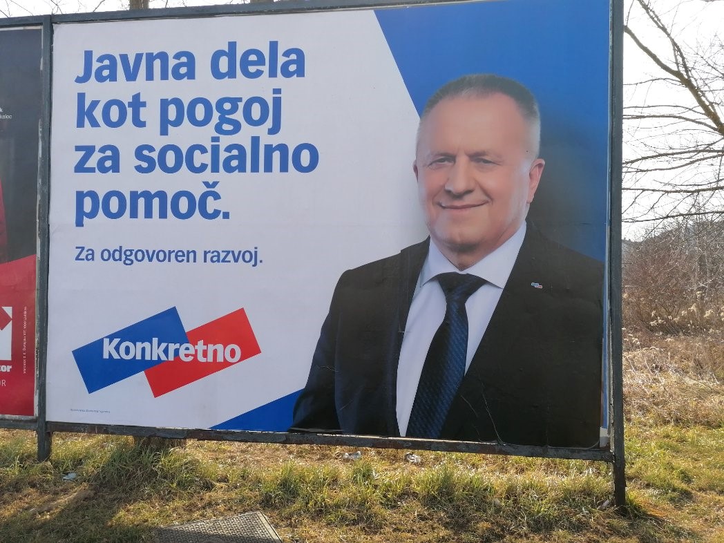 Ne najmlajši predvolilni plakat s predsednikom stranke Počivalškom in geslom stranke Konkretno prinaša nekaj konkretnih programskih ciljev. Po oceni dr. Verčiča izbira ni bila ravno posrečena ...