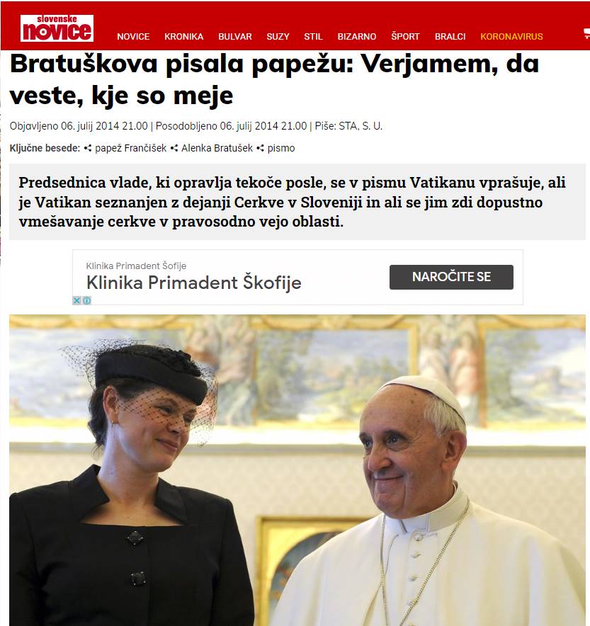 Manever s "pisanjem papežu Frančišku" je Bratuškovi pomagal preživeti na volitvah 2014. (zajem slike: Slovenske novice)