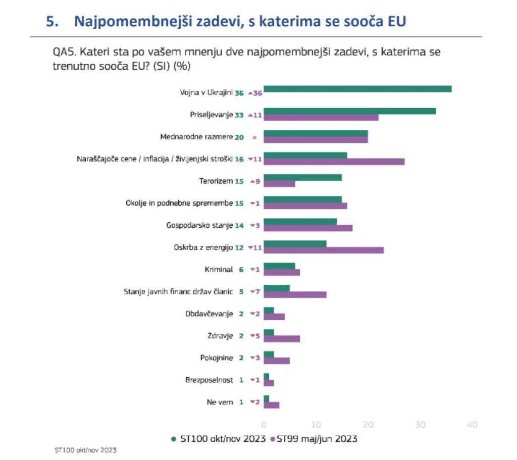 Po podatkih evrobarometra so okolje in podnebne spremembe po pomembnosti za državljane članic EU šele na šestem mestu. Bistveno večjo pomembnost evropski volivci dajejo migracijam, mednarodnim razmeram, vojni v Ukrajini, naraščajočim življenjskim stroškom in terorizmu. Letošnjo jesen je okolje na prvo mesto postavilo le še 16 odstotkov Evropejcev, kar je 6 odstotnih točk manj kot spomladi, med Slovenci je takšnih 15 odstotkov.