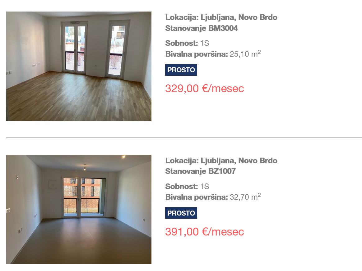 Cene najema v ljubljanski soseski Novo Brdo za najmanjša stanovanja, ki so na voljo. Vir: Stanovanjski sklad RS