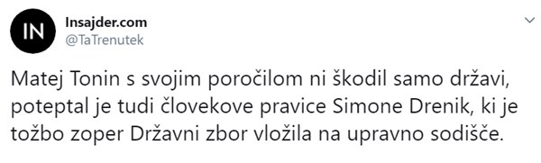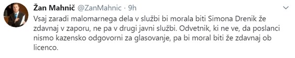 "Če bi ta gospa/Drenik/ tako skrbela za javni interes, kot s to tožba za svoj privatni.. tako poslanec Zorčič. 👍👏