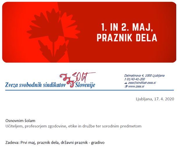 V preteklem tednu je na osnovne in srednje šole Zveza svobodnih sindikatov Slovenije (ZSSS) poslala dopis, v katerem učitelje vzpodbuja, naj v pouk vključijo vsebine v povezavi s 1. majem, njegovim praznovanjem in delavskimi pravicami.