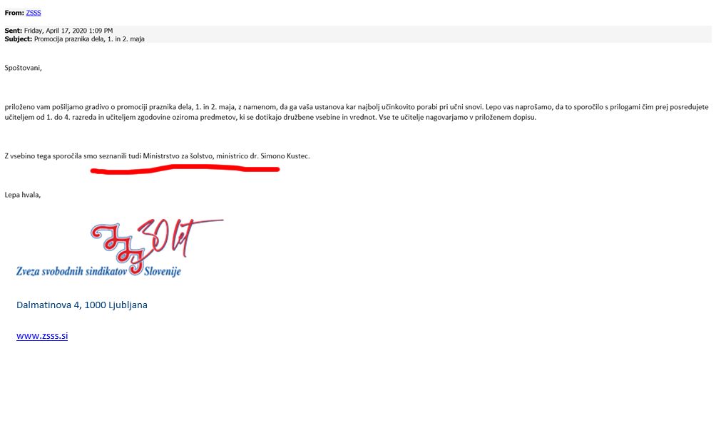 Od kar se je pouk preselil na splet, so učitelji še bolj kot običajno zasuti z raznimi promocijami založb in zavodov, ki ponujajo učne pripomočke, seminarje in druge bolj ali manj kvalitetne in relevantne vsebine za izvajanje pouka na daljavo. Tem promocijam se je pridružilo tudi vabilo ZSSS učiteljem, da svoje učence vzpodbudijo k praznovanju 1. maja na daljavo v katerem so zapisali, da so z aktivnostmi na ministrstvu seznanjeni.
