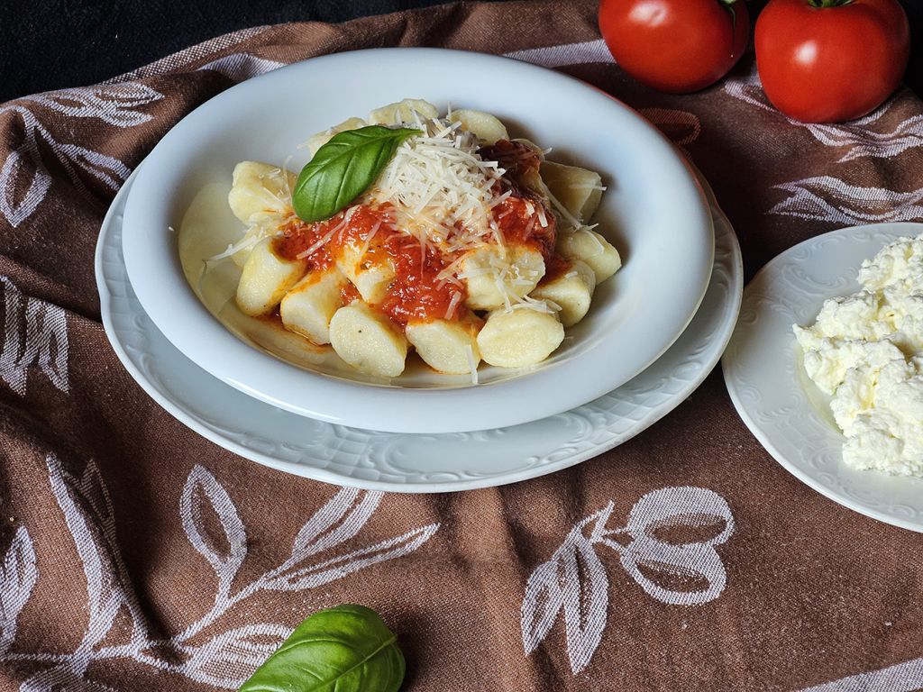 - Ko voda zavre, vanjo postopoma spustimo vse njoke. Ko njoki priplavajo na površino, jih s penovko poberemo iz slanega kropa in zamešamo s poljubno omako. Sama sem jih tokrat pripravila s paradižnikovo omako.
