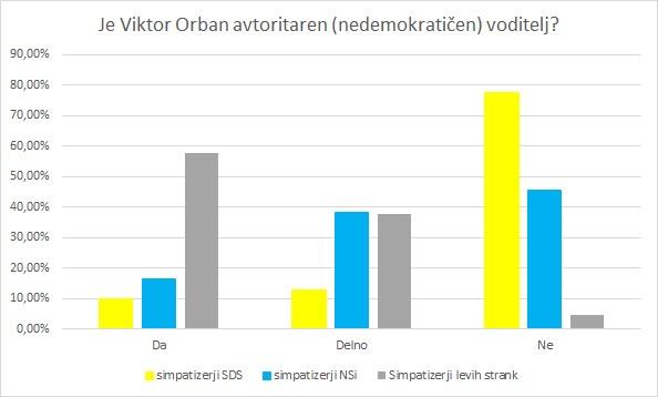 Podobna so razmerja pri vprašanju ali je Orban avtoritaren, oziroma nedemokratičen voditelj. Tako meni večina simpatizerjev levih in levo-sredinskih strank in manjšina volivcev desno-sredinskih strank.