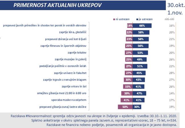 Vladni ukrepi za omejevanje širjenje koronavirusa so namreč ocenjeni manj kritično kot pred dvema tednoma, kaže raziskava. Najmanj podpore imata sicer prepoved gibana med občinami in obvezna uporaba maske na odprtem.