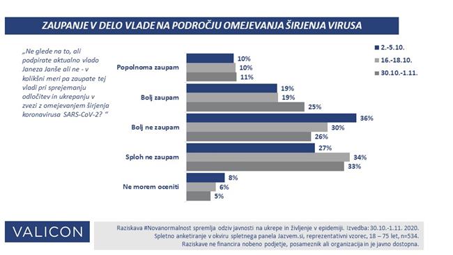 Anketiranci sicer še vedno večinsko izražajo nezaupanje v delo vlade na področju širjenja virusa, a to zaupanje je v zadnjih štirinajstih dneh naraslo.