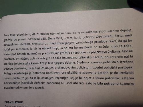 Oglasil pa se je tudi Črt Jereb Skrt, ki je bil včasih v policiji in je aretiral enega od znanih kriminalcev romske populacije. Cela uprava je iskala storilca, na koncu je bil kot policist skoraj na zagovoru, ker ga je aretiral. Cigan mu je grozil, tudi njegovi družini, a je okrožno državno tožilstvo v Kopru ovadbo zavrglo. Cigana je »rešila« izjava – policistu je namreč med drugim rekel, da se mu bo maščeval zob za zob. Tožilstvo je ocenilo, da besede ne predstavljajo grožnje z napadom na policistovo življenje, telo ali prostost, saj gre pri načelu zob za zob za t. i. talionsko načelo – glede na ravnanje policista bi izrečene besede pomenile, da bo osumljeni z oškodovanim policistom izvedel policijski postopek. Zapisali so še, da je treba upoštevati okoliščine – osumljeni je bil razburjen, saj je bil ujet, vloženim naporom navkljub. »Zato je bilo potrebno kazensko ovadbo tudi v tem delu zavreči«. Kdo je tu nor?