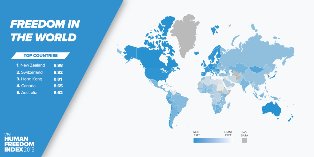 Slovenija je v letošnjem poročilu glede indeksa človekove svobode ohranila 35. mesto, ki ga je zasedala že lani. Med 162 državami je sam vrh drugo leto zapored osvojila Nova Zelandija.