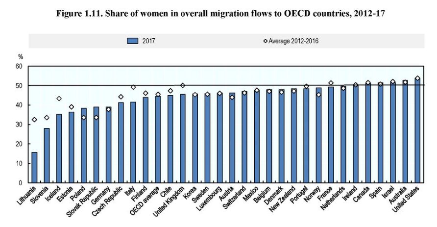Odstotek žensk v migracijskih tokovih v letu 2017 in povprečje let 2012 - 2017. Vir: OECD