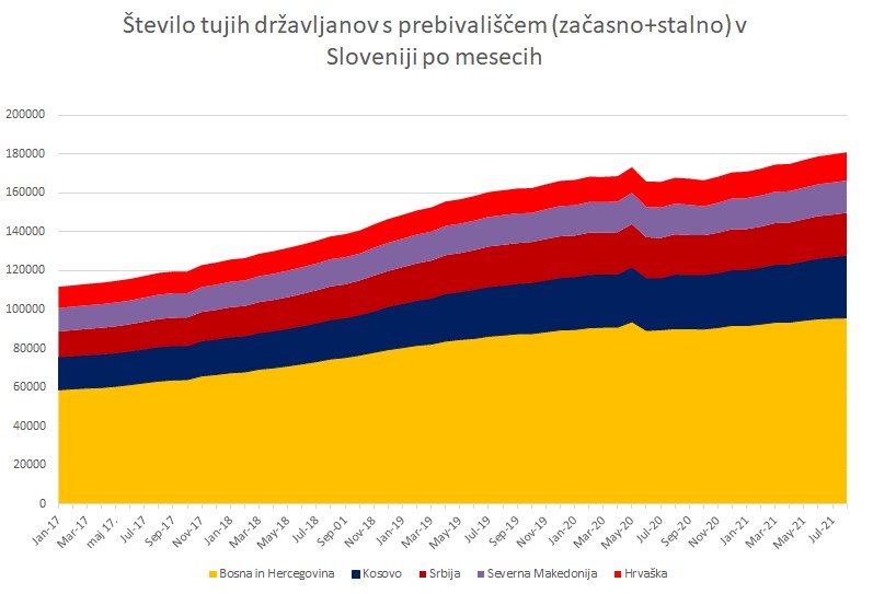 Število izdanih dovoljenj za stalno in začasno prebivanje v Sloveniji se povečuje. Zadnji podatki Ministrstva za notranje zadeve, objavljeni do avgusta letos kažejo, da je bilo avgusta letos v Sloveniji nekaj manj kot 96.000 državljanov Bosne in Hercegovine s stalnim ali začasnim dovoljenjem za prebivanje, ki med priseljenci prevladujejo. To je je preko 5.500 več kot avgusta lani, skoraj 8900 več kot avgusta predlani ter preko 21.100 več kot leta 2018. Po deležu priseljevanja prebivalcem BiH sledijo priseljenci iz Kosova, Srbije, Severne Makedonije in Hrvaške.