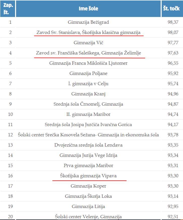 Na tej so se tri od štirih katoliških gimnazij uvrstile med prvo dvajseterico šol, katerih dijaki so imeli v povprečju najboljše maturitetne rezultate. Škofijska klasična gimnazija, ki deluje v okviru Zavoda sv. Stanislava v Šentvidu, je bila uvrščena na 2. mesto, takoj za državno gimnazijo Bežigrad. Gimnazija Želimlje je bila 4., Škofijska gimnazija Vipava pa 16.