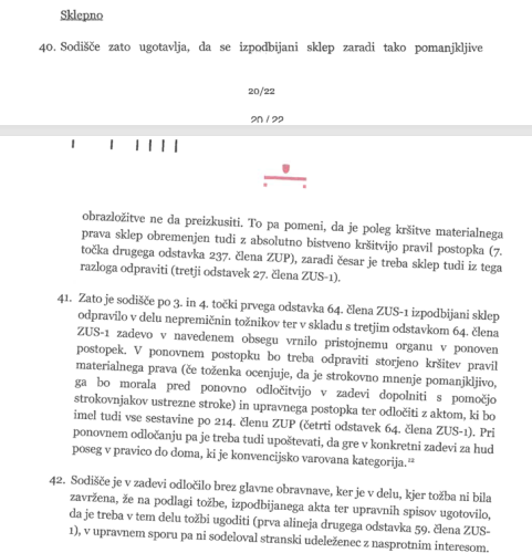 Že aprila je namreč upravno sodišče ugotovilo, da ne gre za akt, ki bi se lahko izpodbijal v upravnem sporu, sodno varstvo bi bilo možno tako uveljavljati šele zoper odločbo, ki bi bila izdana ob sami razlastitvi. Tožbo so tako sprva zavrgli. A se vrhovno sodišče s stališčem upravnega sodišča ni strinjalo. Sklep o zavrženju tožbe so razveljavili in zadevo vrnili na upravno sodišče. Vrhovno sodišče je naložilo, da se mora v ponovnem postopku upoštevati, da gre za akt, ki se ga lahko izpodbija v upravnem postopku. Kot je pojasnilo upravno sodišče, je toženka sicer šele naknadno navedla, da pravni interes ni podan pri določenih tožnikih, ki so po vložitvi tožbe podpisali tudi prodajno pogodbo. S tem so toženki dovolili vknjižbo lastninske pravice v njeno korist.