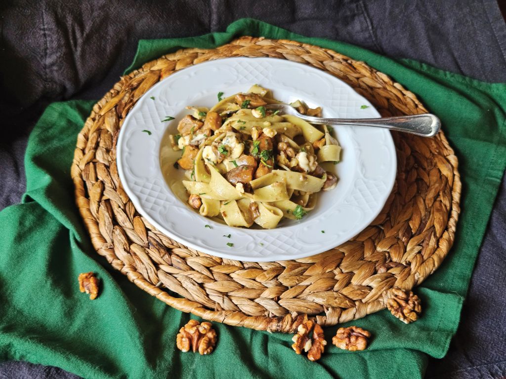 Špargljevi rezanci z jurčki, gorgonzolo in orehi