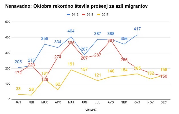 Oktobra je notranje ministrstvo dobilo v letošnjem letu največ prošenj za azil in hkrati tudi največ v zadnjih treh letih. Bilo jih je 417, poroča Spletni časopis. Naraščajoče število prošenj za azil ne pomeni, da je v Sloveniji več tujcev, ki potrebujejo našo zaščito, še poroča.