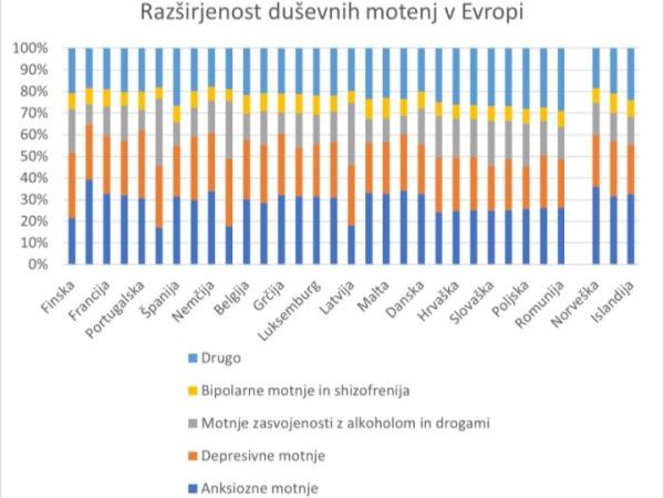 Duševnih težav je čedalje več. Izrazit poskok duševnih motenj so beležili ob pandemiji koronavirusa, a tudi pred njo – po podatkih Evropske komisije naj bi vsak šesti prebivalec EU trpel za psihičnimi težavami. Kot je razvidno s spodnjega grafa, so najpogostejše depresivne in anksiozne duševne motnje. Težave so disproporcionalno razširjene pri mlajših: depresija se je med mladimi podvojila in danes približno polovica mladih v EU poroča o duševnih težavah. Naročniška vsebina
