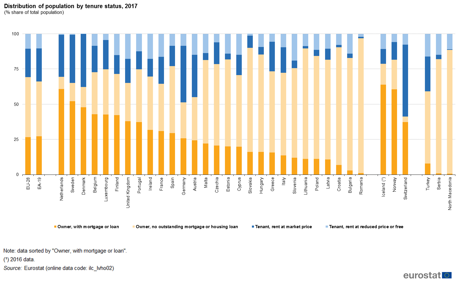 V letu 2017 je 26,5 % evropske populacije živelo v stanovanju, obremenjenem s posojilom ali hipoteko, medtem ko jih je 42,2 % posedovalo stanovanje brez dolgov, vezanih nanj. Skupaj je torej v lastniških stanovanjih živelo 69,3 % Evropejcev.