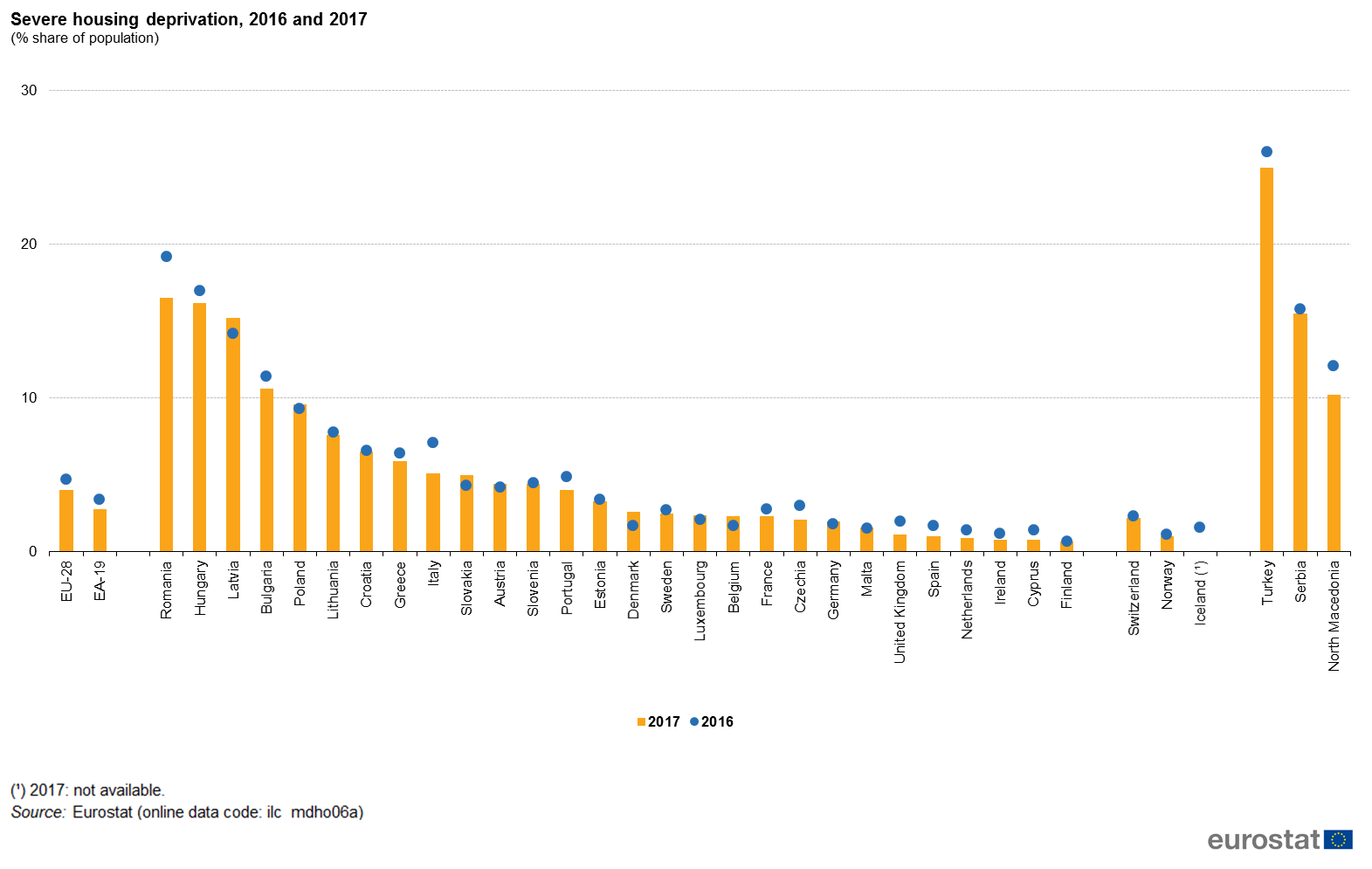 So stanovanja tako v primerjavi s prihodki draga tako za najem kot nakup? Razlike med članicami EU so bile resnično zelo velike. Obstajajo številne države, pri katerih le majhen delež prebivalstva živi v stanovanjih, katerih stroški presegajo 40 % razpoložljivih dohodkov. To velja zlasti za Malto (1,4 %) in Ciper (3,1 %). Povsem drugačno je stanje v Grčiji, kjer je bilo v takšnem stanovanju leta 2017 kar 40,5 % populacije. Velik delež je bil tudi v Bolgariji (20,7 %), Nemčiji (15,8 %) in na Danskem (15 %).