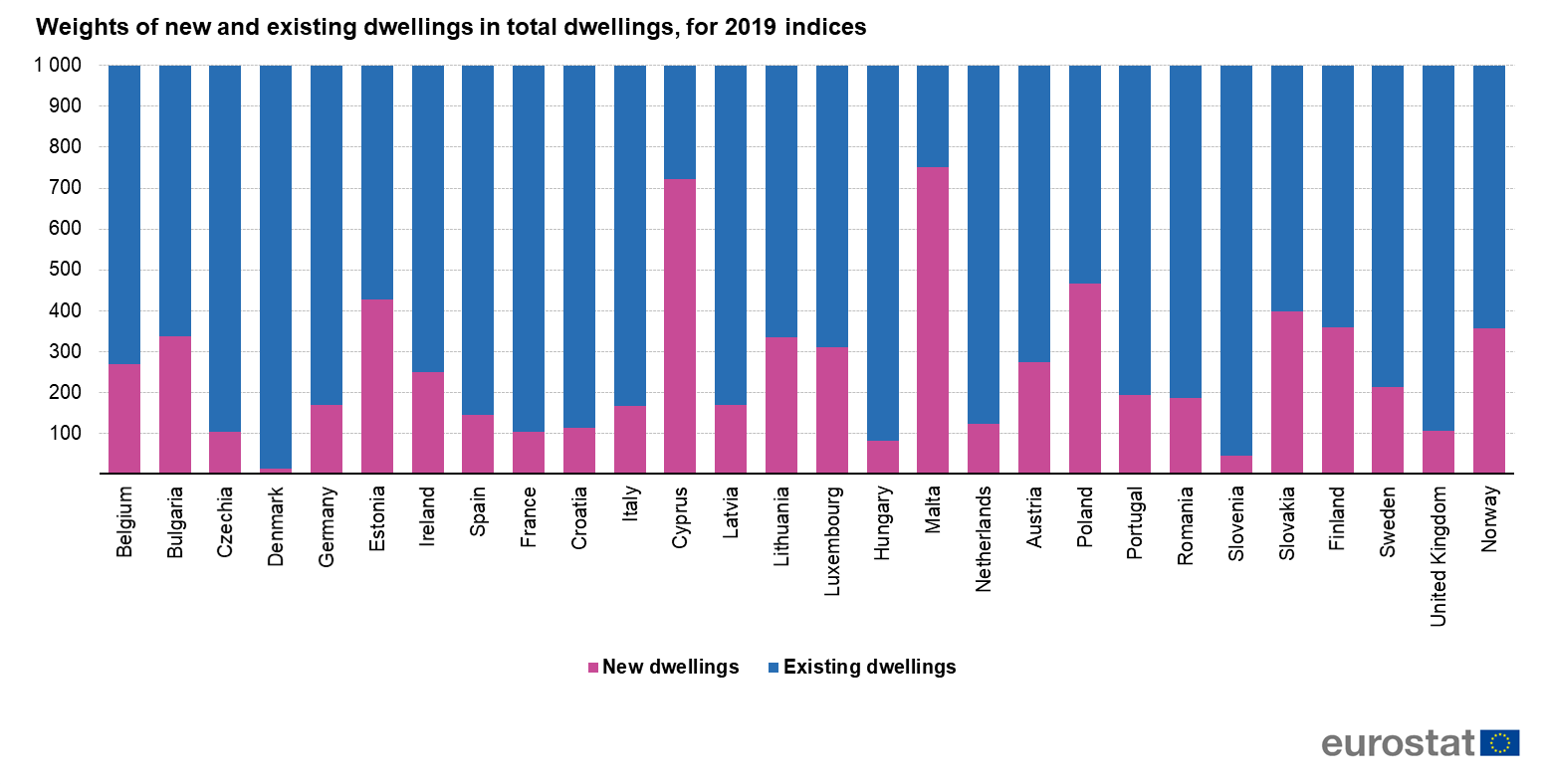 Delež novih stanovanjskih objektov na trgu v primerjavi s ponudbo rabljenih (ocene za leto 2019). Vir: Eurostat.